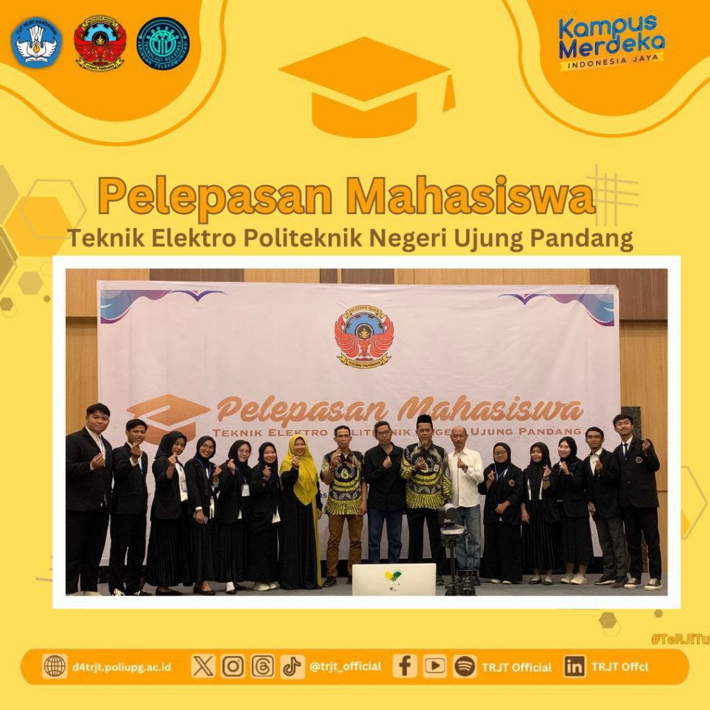 MAKASSAR, TRJT NEWS – Tanggal 21 September 2023 telah dilaksanakan prosesi sederhana Pelepasan Mahasiswa Teknik Elektro PNUP. Pada prodi Teknologi Rekayasa Jaringan Telekomunikasi (TRJT), dihadiri sebagian alumni dan calon alumni pada periode Wisuda Agustus & Oktober 2023, baik secara Onsite maupun Online. Prosesi ini dihadiri pula dari Pengurus Ikatan Alumni Teknik Elektro (IKATE) PNUP. Di tahun 2023 ini, prodi TRJT sudah memiliki Angkatan Alumni ke-2 dari kelas angkatan masuk 2019. Kegiatan ini dirangkaian pelaksanaan 1 dekade Seminar Nasional Teknik Elektro dan Informatika (SNTEI).